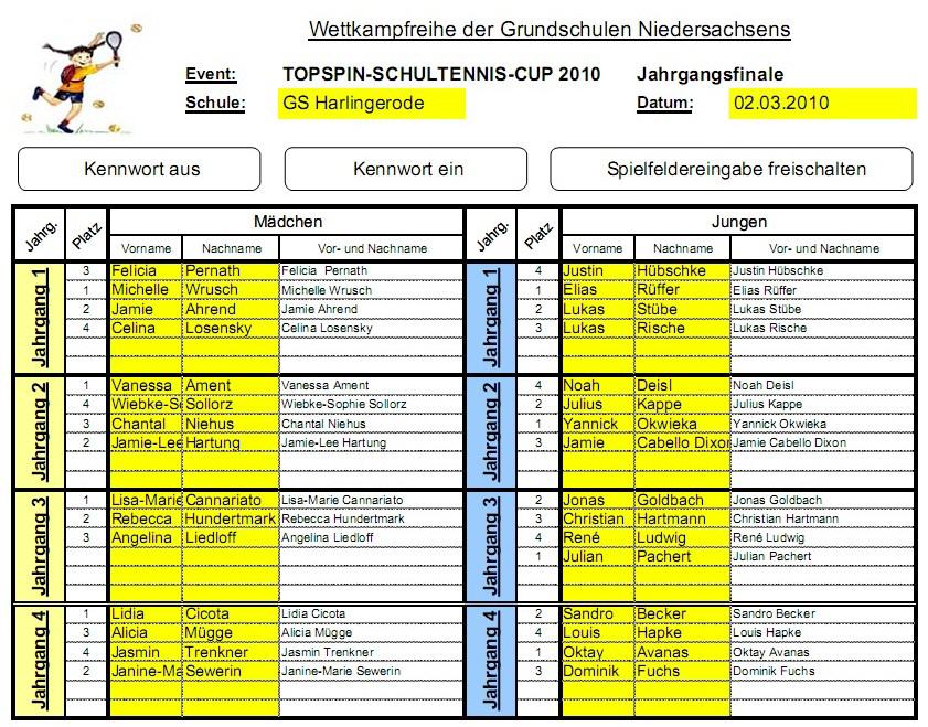 Bilder vom Turnier Die Sieger Die Sieger (PDF-Datei) st-cup_v3-5_gs-harlingerode-jahrgangsfinale.pdf [36 KB] ...und Action! Teilnehmer und Zuschauer Die Siegerehrung Schultennis
